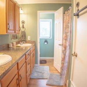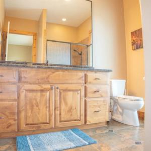 The main home has a very friendly floor plan (4383 square feet per plans) with three full bedrooms and three and a half bathrooms. Each bedroom has its own full bathroom and private door to the exterior. The primary bedroom is surrounded with windows exposing the view and linked to an extravagant bathroom and abundantly large closet with an island that is useful for packing suitcases or folding clothes. The thought that went into this design is apparent. Also, the primary shower stall is also wheelchair accessible and very large with amazing custom tilework and detail.